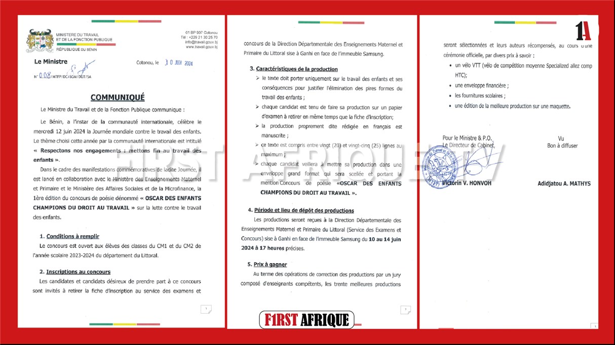 le ministère du travail et de la fonction publique en collaboration avec le ministère des Affaires Sociales et de la Microfinance et ministère de l’Enseignement Maternel et Primaire lance la première édition du concours de poésie intitulé « OSCAR DES ENFANTS CHAMPION DU DROIT AU TRAVAIL ». Il est destiné aux élèves en classe du CM1 et CM2 du département du Littoral.